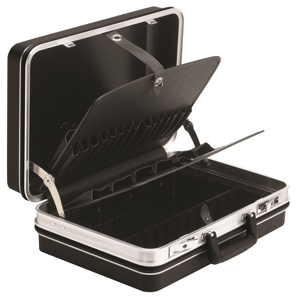 Aluminium frame, 2 kantelsloten, ergonomische draaggreep, sterke dekselscharnieren, gereedschapsblad met 21 insteekvakken en geïntegreerd documentenvak, ABS-bodembak incl. afdekblad met 6 insteekvakken.
