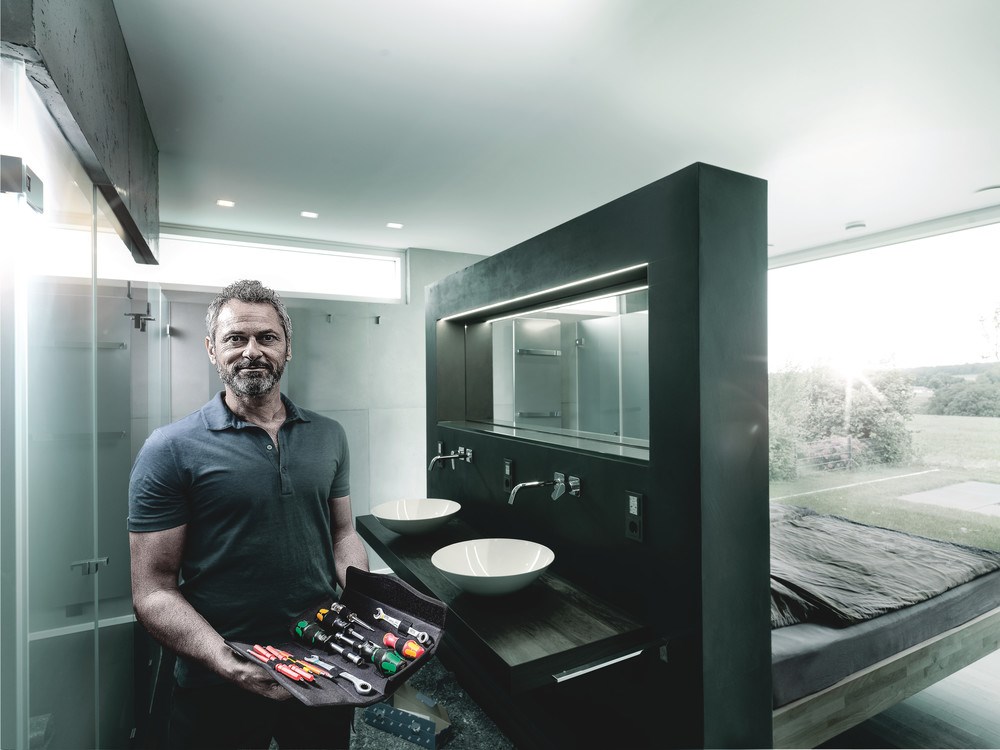 Compacte gereedschapsset met de 15 belangrijkste schroefgereedschappen voor de sanitair- en verwarmingssector. Inclusief 2 Joker Switch steeksleutels, VDE handhouder plus 4 extra smalle klingen, spanningszoeker, 4 stiftsleutels met rubberen ommanteling, schroefbeitel en 2 Kraftform Plus dopschroevendraaiers met holle as. Details: Twee afgeschuinde, omschakelbare Joker steek/ring-ratelsleutels met speciale vasthoudplaat ter voorkoming van wegglijden/verlies van de moer alsmede voor extra krachtoverdracht; 1 VDE handhouder en 4 VDE iS klingen voor veilig werken tot 1000 Volt (iS met gereduceerde klingdiameter en geïntegreerde beschermisolatie voor het bereiken en bedienen van diepliggende schroeven en veerelementen); 1 spanningszoeker 247; 4 stiftsleutels met Hex-Plus profiel tegen doordraaien van schroeven; 1 Kraftform schroefbeitel 932 A sleuf met doorlopende zeskant-kling en geïntegreerde slagkap voor schroef- en lichte beitelwerkzaamheden; 2 stuks dopschroevendraaier 395 HO met holle as voor het vastzetten of losdraaien van moeren op lange bouten alsmede voor vastzittende schroeven. ‘Take it easy’ Toolfinder met kleurcodering op profiel en maatcode – voor het eenvoudig en snel vinden van het benodigde gereedschap.