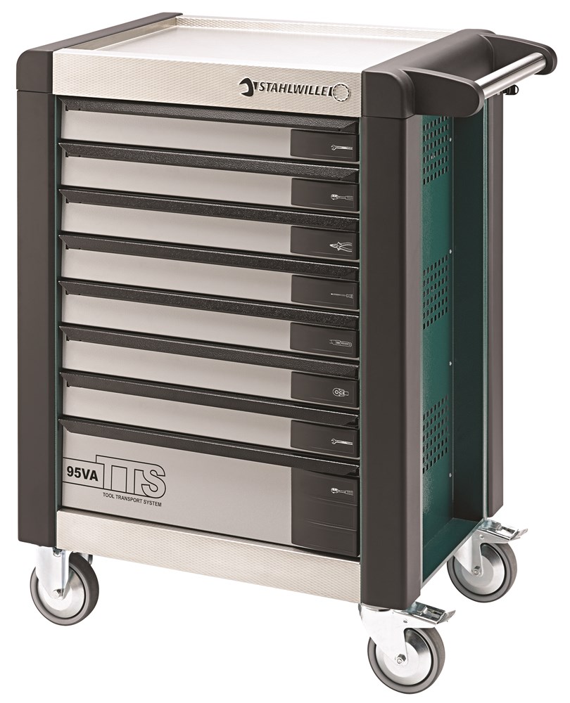 8 eenvoudig uitneembare schuifladen met kogelgelagerde geleiding, volledig uittrekbaar. Drieledig veiligheidsconcept: - Centrale vergrendeling d.m.v. cilinderslot met omklapbare sleutel. - schuifladen afzonderlijk vergrendelbaar zodat per ongeluk openen tijdens het verplaatsen wordt voorkomen. - Omkipbeveiliging - gelijktijdig opentrekken van meerdere schuifladen is niet mogelijk. Aanduiding inhoud schuifladen d.m.v. meerdere pictogrammen per schuiflade (vel met pictogrammen inbegrepen). Greep uit edelstaal met versterkte bevestiging. Hoekprofielen met stootdemping. Resistent, krasbestendig werkblad en dito lijst uit edelstaal met diamantreliëf. Olie- en zuurbestendige wielen (diameter in mm 125 mm) met bescherming voor de lagers tegen vuil, met 2 vastzetremmen. Papierrolhouder. 5 standaardkleuren, schuifladen tweekleurig (zilver met zwarte grepen). Aan beide zijden perforatiegaten voor haken nr. 8031-8041, bijv. voor grote gereedschappen. In te richten met STAHLWILLE standaard- en TCS-inleggen.