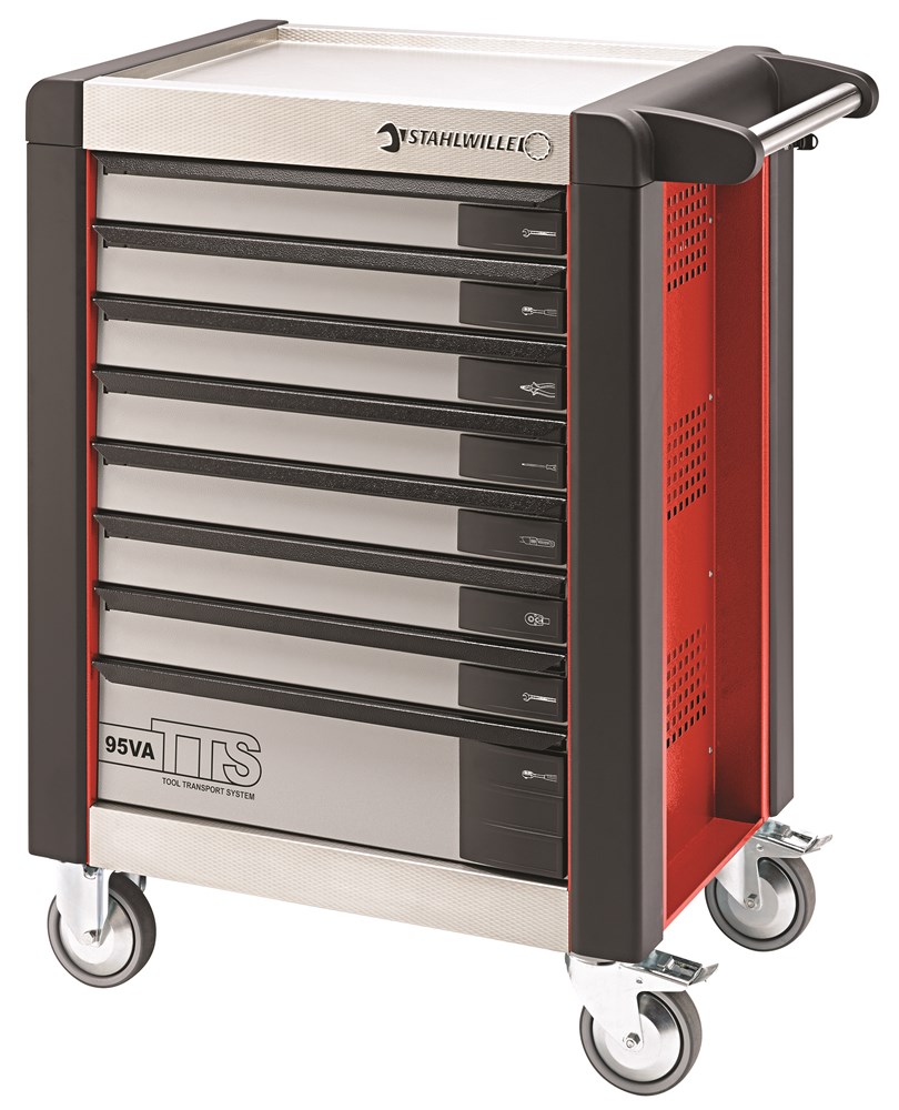 8 eenvoudig uitneembare schuifladen met kogelgelagerde geleiding, volledig uittrekbaar. Drieledig veiligheidsconcept: - Centrale vergrendeling d.m.v. cilinderslot met omklapbare sleutel. - schuifladen afzonderlijk vergrendelbaar zodat per ongeluk openen tijdens het verplaatsen wordt voorkomen. - Omkipbeveiliging - gelijktijdig opentrekken van meerdere schuifladen is niet mogelijk. Aanduiding inhoud schuifladen d.m.v. meerdere pictogrammen per schuiflade (vel met pictogrammen inbegrepen). Greep uit edelstaal met versterkte bevestiging. Hoekprofielen met stootdemping. Resistent, krasbestendig werkblad en dito lijst uit edelstaal met diamantreliëf. Olie- en zuurbestendige wielen (diameter in mm 125 mm) met bescherming voor de lagers tegen vuil, met 2 vastzetremmen. Papierrolhouder. 5 standaardkleuren, schuifladen tweekleurig (zilver met zwarte grepen). Aan beide zijden perforatiegaten voor haken nr. 8031-8041, bijv. voor grote gereedschappen. In te richten met STAHLWILLE standaard- en TCS-inleggen.