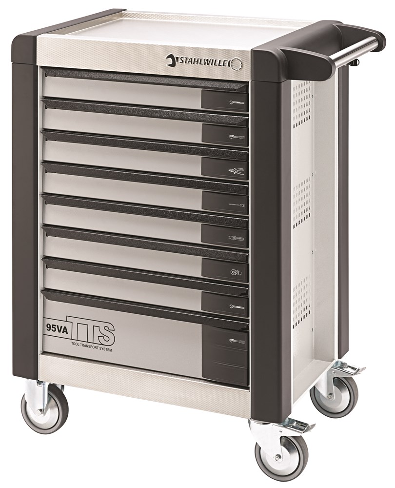 8 eenvoudig uitneembare schuifladen met kogelgelagerde geleiding, volledig uittrekbaar. Drieledig veiligheidsconcept: - Centrale vergrendeling d.m.v. cilinderslot met omklapbare sleutel. - schuifladen afzonderlijk vergrendelbaar zodat per ongeluk openen tijdens het verplaatsen wordt voorkomen. - Omkipbeveiliging - gelijktijdig opentrekken van meerdere schuifladen is niet mogelijk. Aanduiding inhoud schuifladen d.m.v. meerdere pictogrammen per schuiflade (vel met pictogrammen inbegrepen). Greep uit edelstaal met versterkte bevestiging. Hoekprofielen met stootdemping. Resistent, krasbestendig werkblad en dito lijst uit edelstaal met diamantreliëf. Olie- en zuurbestendige wielen (diameter in mm 125 mm) met bescherming voor de lagers tegen vuil, met 2 vastzetremmen. Papierrolhouder. 5 standaardkleuren, schuifladen tweekleurig (zilver met zwarte grepen). Aan beide zijden perforatiegaten voor haken nr. 8031-8041, bijv. voor grote gereedschappen. In te richten met STAHLWILLE standaard- en TCS-inleggen.
