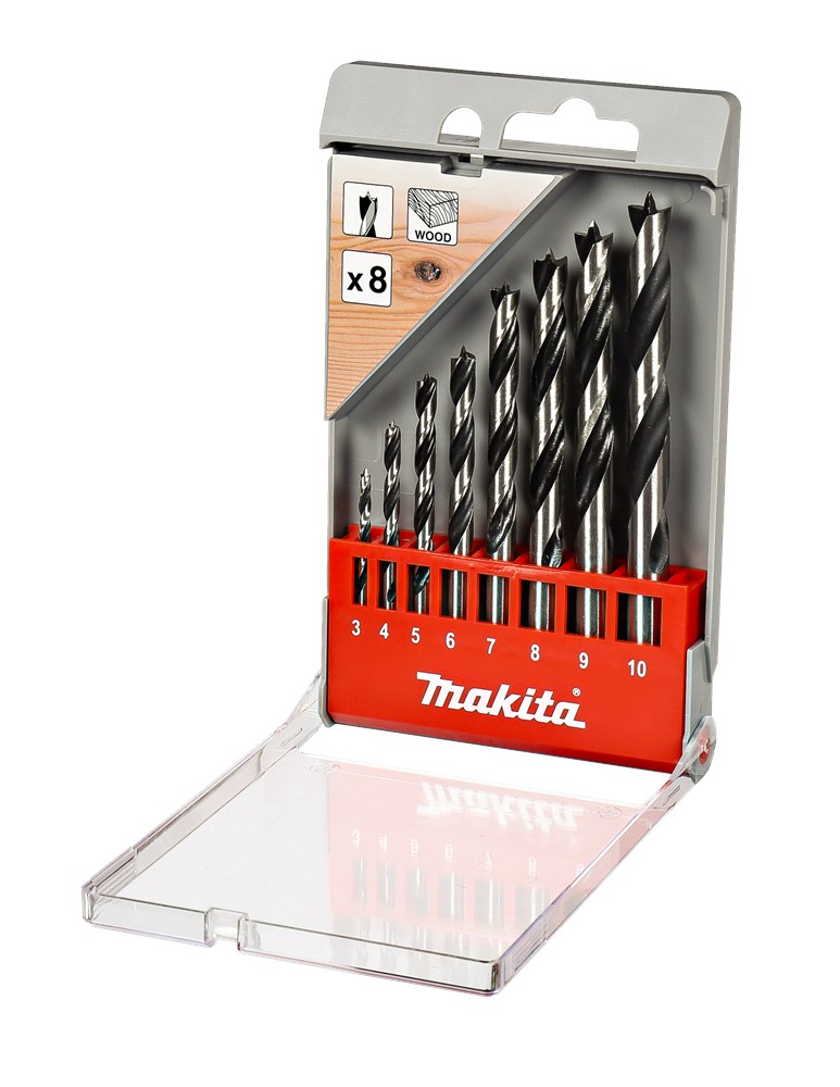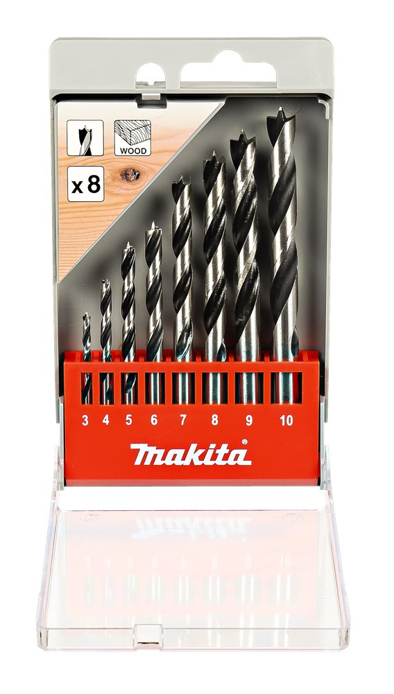 Makita 8-delige houtspiraalborenset met cilindrische opname in overzichtelijke kunststof cassette. Inhoud: 3, 4, 5, 6, 7, 8, 9 en 10 mm.
