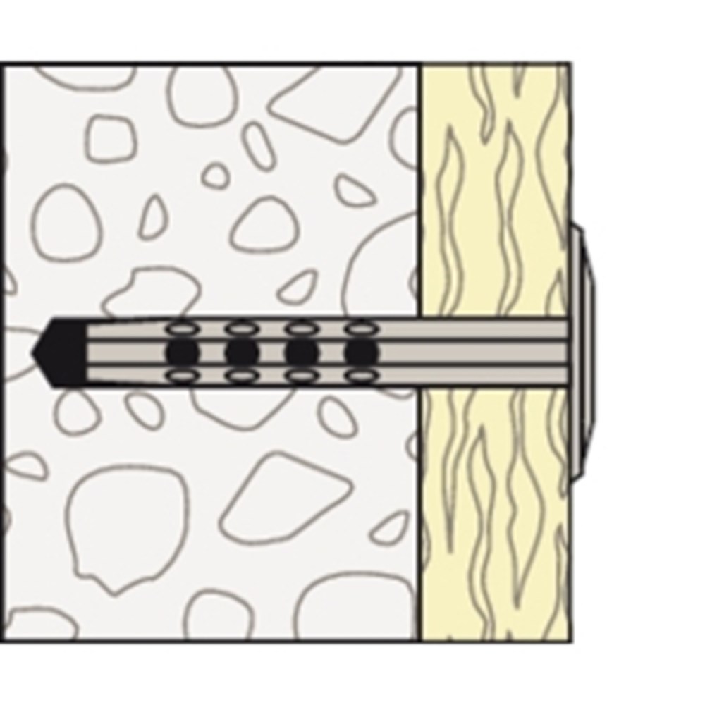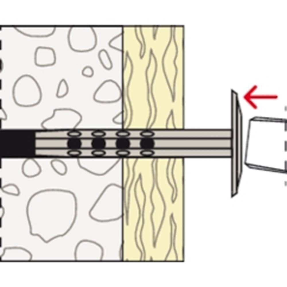 De fischer Isolatieplug metaal DHM wordt gewoon met de hamer ingetikt. Met deze slagmontage gaat het aanbrengen razendsnel en met minder inspanning. Dankzij de bereikte brandwerendheidsduur R 120 is het gebruik ook bij hoge eisen aan de brandwerendheidsduur mogelijk. Met de Isolatieplug metaal DHM kan bijvoorbeeld steen- en glaswol en kunnen schuimglasplaten evenals houtwolplaten worden bevestigd.