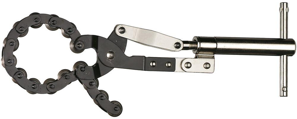 Traploos, met draaigreep, ook voor edelstaalpijp tot 1,8 mm wanddikte geschikt, kettinglengte 270 mm.