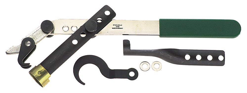 Met verwisselbare haken en verwisselbare neerdrukker. Geschikt voor bijna alle personenwagens, meestal zonder demontage van de cilinderkop.