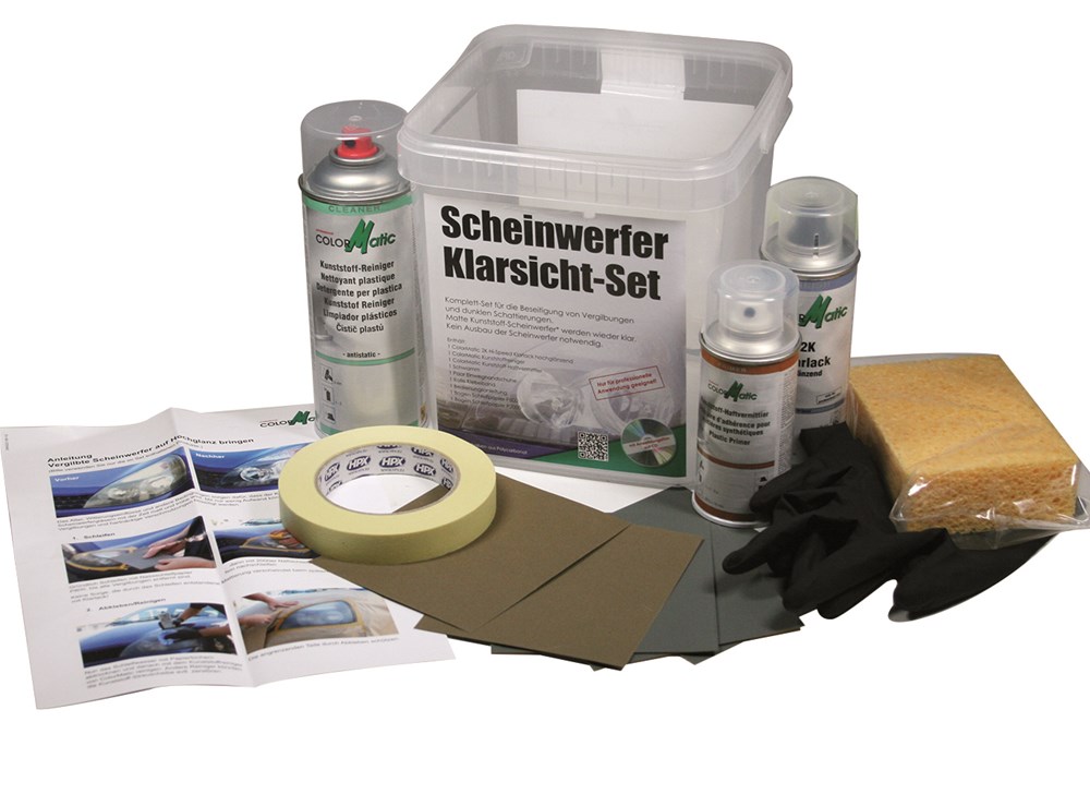 De ColorMatic koplamp renovatie set werd speciaal samengesteld voor het herstellen van vergeelde koplampen. Met behulp van de producten in deze set worden matte plastieken koplampen opnieuw helder en dit zonder demontage. Na het opschuren van de matte film wordt het oppervlak opnieuw verzegeld door middel van onze 2K Hi-Speed Clear Coat en biedt het opnieuw een glanzend resultaat met een optimale UV bescherming.
