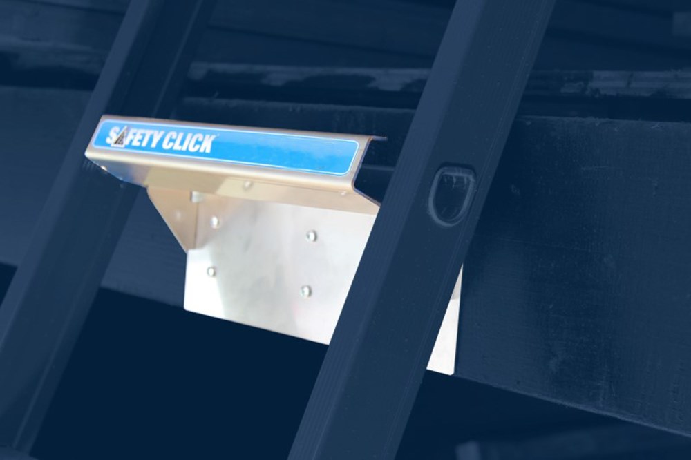 Deze Aluminium Safetyclick® is gecombineerd met een Aluminium uitwijkconsole voorzien van idem buiskoppelingen. De Safetyclick® type V kan op iedere gewenste hoogte aan een steiger, truss of andere buisconstructie geplaatst worden, waarna men veilig de ladder kan plaatsen om op gewenste hoogte te kunnen komen.