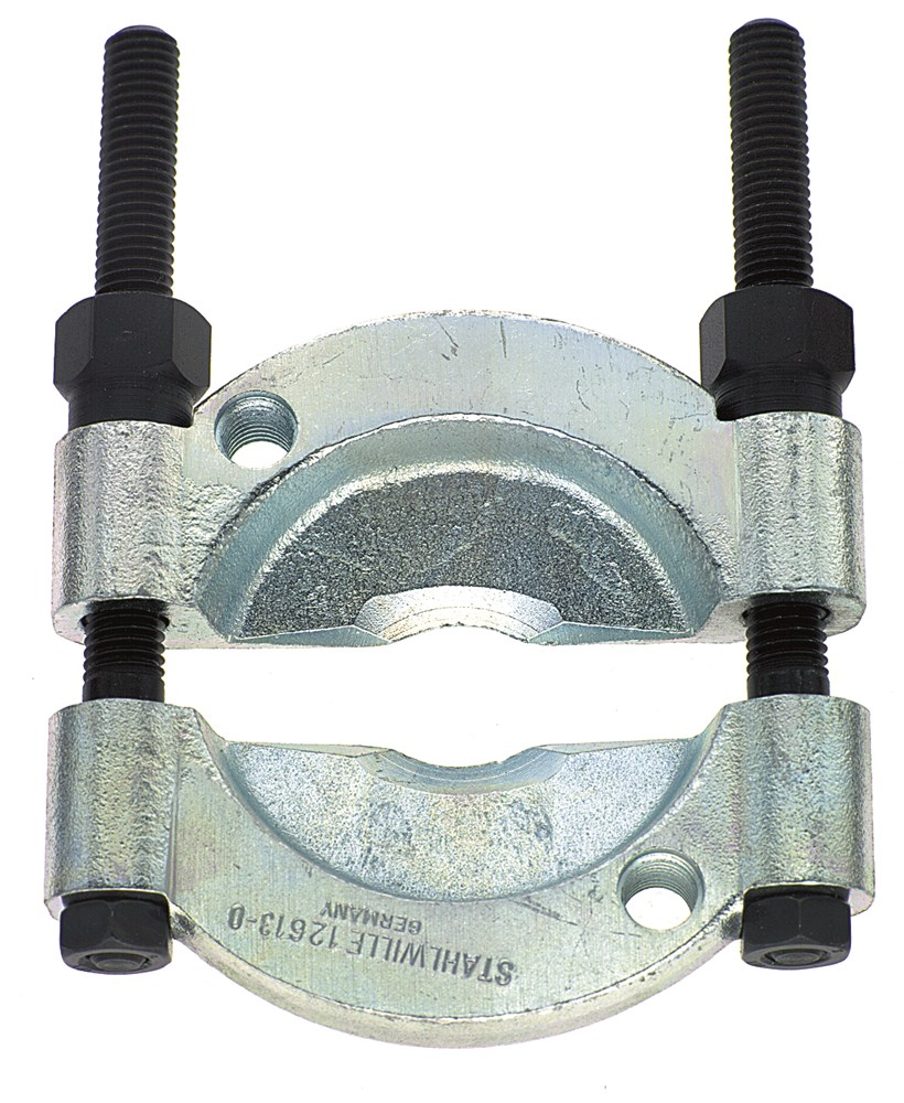 Verzinkt; passend op nr. 12614N van dezelfde grootte; voor het lostrekken van kogellagers, rollagers, bussen, binnenringen en andere, dicht op elkaar zittende delen; het gelijkmatig aandraaien van de moeren op de zijbouten scheidt de delen; hulptrekker nr. 12614N aanbrengen; lostrekprocedure voortzetten.