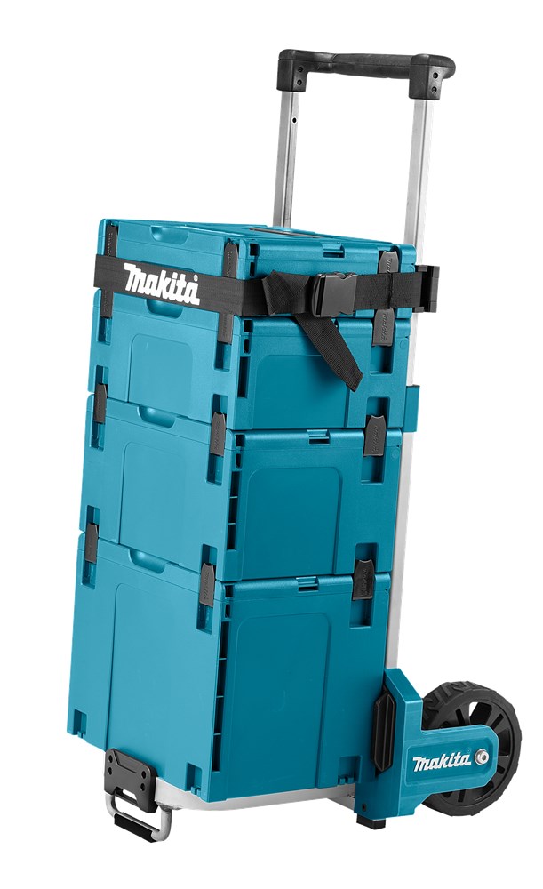 Trolley met zijdelingse steun, stopper en spanband voor het veilig verplaatsen van Mboxen. Nylon spanband is instelbaar. Belastbaar tot 125 kg, op trappen tot 60 kg. Inklapbaar voor ruimtebesparende opslag.