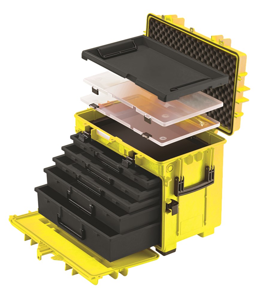Zeer robuust en belastbaar voor professioneel gebruik, laag gewicht door het gebruik van ABS, 5 eenvoudig uitneembare, met transparante deksel afsluitbare schuifladen, schuifladen kunnen er in willekeurige volgorde worden ingeschoven, bovenop en voorop een afneembaar deksel, 1 uitneembare bak met 2 greep en 2 transparante schuifladendeksels onder de bovenste deksel, separaat documentenvak in het deksel, 4 posities voor naamplaatjes, 2 lichtlopende dubbele wielen aan de kant van de telescoopgreep, met 4 extra wielen leverbaar, waarvan 2 met vastzetrem (prijs op aanvraag), uittrekbare telescoopgreep om eenvoudig te transporteren, 2 draaggrepen aan de zijkant, resistent tegen skydrol, aceton, benzine en hydraulische oliën, 20 kg draagkracht, n,b,v, hangslot op 3 posities afsluitbaar.