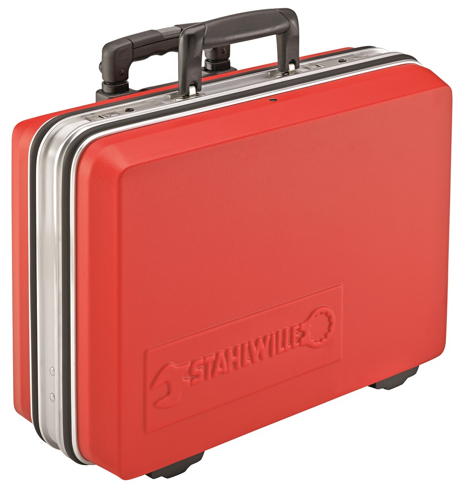 Hardschalenkoffer, met afneembaar trolleysysteem, stevige aluminium frame, 2 kantelsloten, ergonomisch gevormde draaggreep, robuuste dekselscharnieren, tweezijdig in te richten gereedschapsblad met 21 insteekvakken en geïntegreerd documentenvak, indeelbare ABS-inzetbak incl. afdekplaat met 6 insteekvakken.
