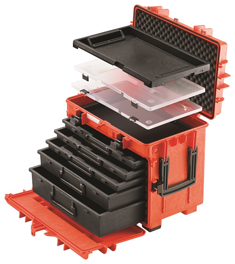 Zeer robuust en belastbaar voor professioneel gebruik, laag gewicht door het gebruik van ABS, 5 eenvoudig uitneembare, met transparante deksel afsluitbare schuifladen, schuifladen kunnen er in willekeurige volgorde worden ingeschoven, bovenop en voorop een afneembaar deksel, 1 uitneembare bak met 2 greep en 2 transparante schuifladendeksels onder de bovenste deksel, separaat documentenvak in het deksel, 4 posities voor naamplaatjes, 2 lichtlopende dubbele wielen aan de kant van de telescoopgreep, met 4 extra wielen leverbaar, waarvan 2 met vastzetrem (prijs op aanvraag), uittrekbare telescoopgreep om eenvoudig te transporteren, 2 draaggrepen aan de zijkant, resistent tegen skydrol, aceton, benzine en hydraulische oliën, 20 kg draagkracht, n,b,v, hangslot op 3 posities afsluitbaar.