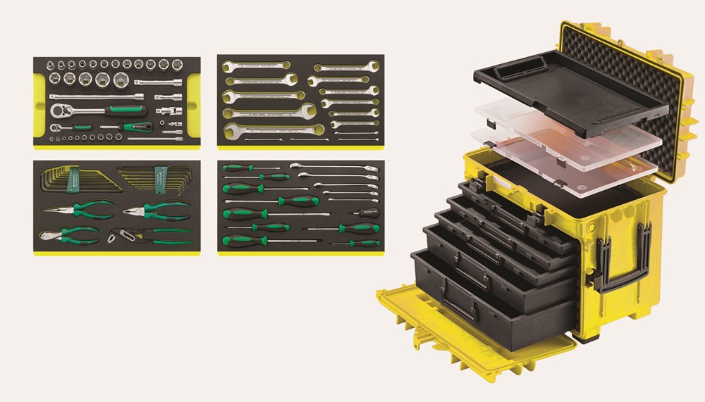 Met 89-delige set, inhoud: 10 doppen 1/4’’, zeskant, 5 t/m 13 mm; 2 verlengstukken 1/4’’, 2’’ en 6’’; steekhecht 1/4’’; kardangewricht 1/4’’; bithouder 1/4’’; ratel 1/4’’; 17 doppen 1/2’’, zeskant, 10 t/m 32 mm; 3 verlengstukken 1/2’’, 3’’, 5’’ en 10’’; kardangewricht 1/2’’; ratel 1/2’’; 15 steekringsleutels, 6 t/m 24 mm; 5 steekringratelsleutels, 8, 10, 13, 17 en 19 mm; 6 sleufschroevendraaiers; 4 kruiskopschroevendraaiers; combitang 180 mm; radiotang 200 mm; zijsnijtang 160 mm; waterpomptang 240 mm; 9 lange inbussleutels met kogelkop, 1,5 t/m 10 mm; 8 lange inbussleutels Torx met kogelkop, T9 t/m T40