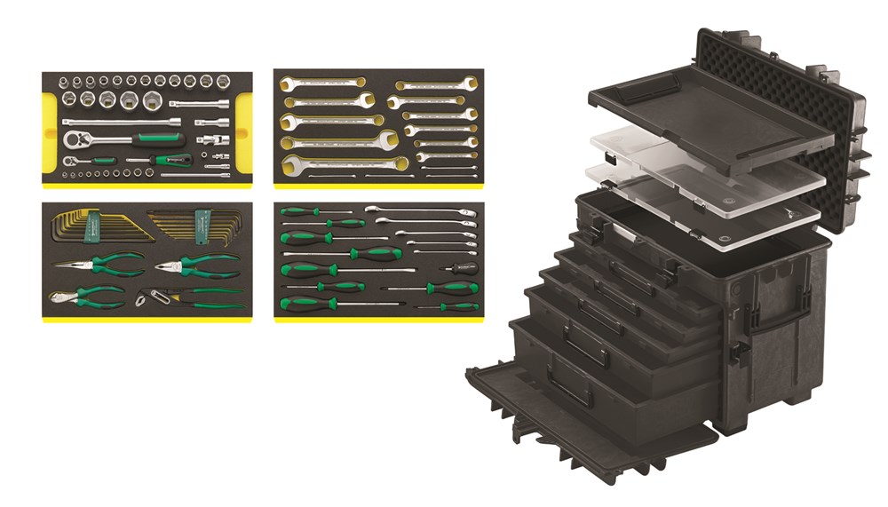 Met 89-delige set, inhoud: 10 doppen 1/4’’, zeskant, 5 t/m 13 mm; 2 verlengstukken 1/4’’, 2’’ en 6’’; steekhecht 1/4’’; kardangewricht 1/4’’; bithouder 1/4’’; ratel 1/4’’; 17 doppen 1/2’’, zeskant, 10 t/m 32 mm; 3 verlengstukken 1/2’’, 3’’, 5’’ en 10’’; kardangewricht 1/2’’; ratel 1/2’’; 15 steekringsleutels, 6 t/m 24 mm; 5 steekringratelsleutels, 8, 10, 13, 17 en 19 mm; 6 sleufschroevendraaiers; 4 kruiskopschroevendraaiers; combitang 180 mm; radiotang 200 mm; zijsnijtang 160 mm; waterpomptang 240 mm; 9 lange inbussleutels met kogelkop, 1,5 t/m 10 mm; 8 lange inbussleutels Torx met kogelkop, T9 t/m T40