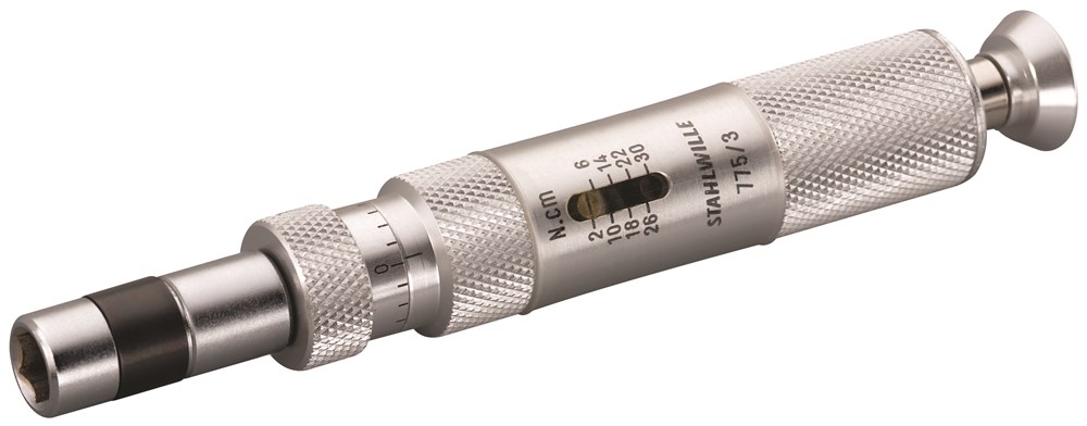 Klikkend, voor het gecontroleerd aanhalen in het cNm-bereik, voor enkelvoudig gebruik en serie-fabricage, schroefdrukveer als meetelement, voor rechtsom-- en linksomgebruik, met 1/4" binnenzeskant (F 6,3 DIN 3126/ISO1173), via micrometerschaal (draaibare schaal) traploos instelbaar, vrijloopkoppeling voorkomt het overtrekken van de ingestelde waarde, vorm en oppervlakte van de handgreep zorgt voor een betrouwbare overbrenging van het aanhaalmoment, insteekgereedschappen: alle bits met 1/4" buitenzeskant E 6,3, zoals kruiskop, POZIDRIV/SUPADRIV®, sleuf, TORX®, zeskant; voor de kleinste schroefverbindingen worden bits met 4 mm buitenzeskant en een bithouder (adapter) nr. 3115/2 voor schroevendraaierbits model C4 en buitenzeskant 1/4" (E 6,3 DIN 3126/ISO 1173) gebruikt, met certificaat, weergave-afwijking ± 6 %.