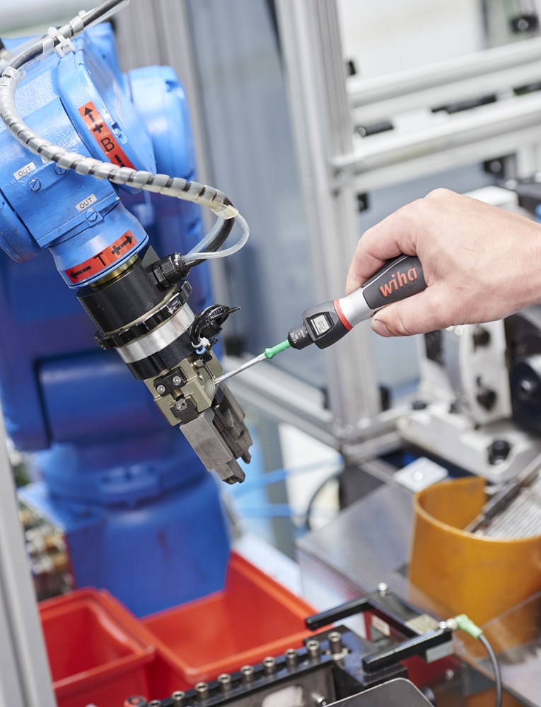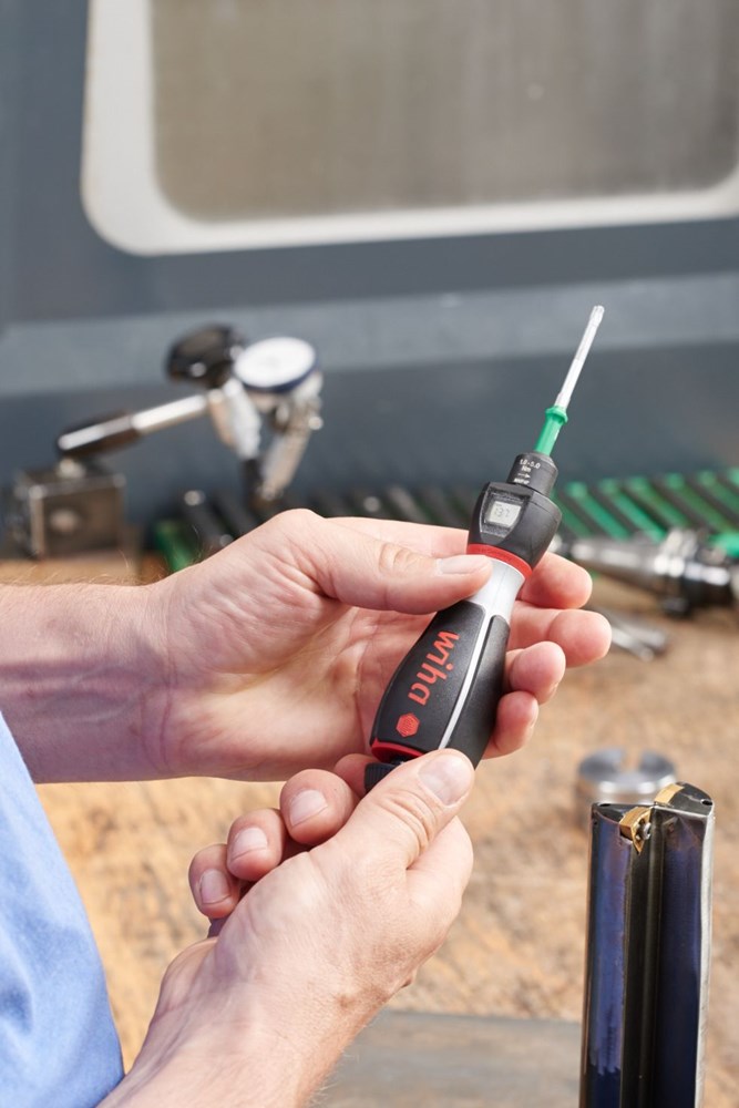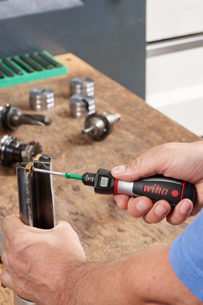 Bij het vervangen van wisselplaten op bewerkingsmachines is gecontroleerd schroeven met het juiste moment essentieel om deze niet te beschadigen. Hier helpt de momentschroevendraaier iTorque®, die zich het best laat beschrijven met de woorden intelligent, innovatief en individueel!. Via de kap op het uiteinde van de handgreep van de iTorque® kan de gewenste Nm-waarde: eenvoudig en traploos worden ingesteld. Bovendien kan de momenteenheid worden omgeschakeld tussen Nm en in.lbs. Met behulp van het grote digitale display met numerieke weergave kan de ingestelde Nm-waarde: snel en eenvoudig worden afgelezen. Met een activeringsnauwkeurigheid van +/- 6% voldoet het momentgereedschap aan de eisen van EN-ISO 6789. Een geïntegreerde teller documenteert het aantal activeringen, wat met name belangrijk is voor de meetmiddelenbewaking. De alarmfunctie herinnert de gebruiker tijdig aan de vastgelegde kalibratiecyclus, die standaard is ingesteld op 5.000 toepassingen en zo nodig individueel kan worden aangepast. Ten slotte zorgt de ergonomisch gevormde handgreep met zachte delen voor een optimaal hanteerbaarheid van de momentschroevendraaier. In de set is een universele bithouder inbegrepen voor opname van 1/4" bits. De iTorque® is daarnaast compatibel met de Wiha Torque 4 mm-wisselschachten (serie 2859).