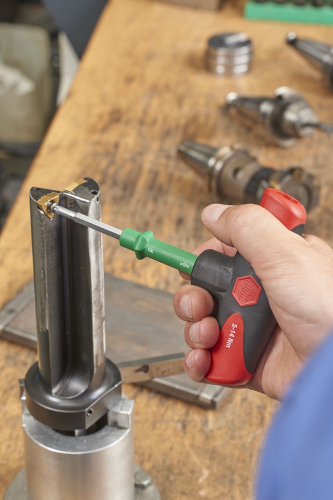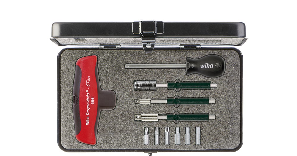 Het aandraaien van schroeven met een gedefinieerde momentwaarde hoger dan 5 Nm vereist met een normale momentschroevendraaier een grote krachtsinspanning. Dat gaat aanmerkelijk eenvoudiger met de momentschroevendraaier met dwarsgreep TorqueVario®-S Tplus. Met behulp van de geïntegreerde numerieke schaalverdeling en het meegeleverde instelgereedschap kan het momentbereik variabel worden ingesteld en kan zo een groot toepassingsgebied worden afgedekt. Een duidelijk hoor- en voelbaar signaal bij activering van het moment garandeert een hoge procesbetrouwbaarheid en beschermt tegen materiaalbeschadigingen en nabewerkingen. De geïntegreerde slipkoppeling voorkomt dat de gewenste momentwaarde wordt overschreden. Met een activeringsnauwkeurigheid van +/- 6% voldoet het momentgereedschap aan de eisen van EN-ISO 6789. De comfortabele dwarsgreep met zachte delen zorgt voor een optimale momentoverdracht. Naast de momentdwarsgreep bevat de set tevens 1/4" en 3/8" binnenvierkant-adapterschachten, een bithouderadapter en zes enkele bits. Bovendien is de TorqueVario®-S Tplus compatibel met de Wiha wisselschachten voor momentschroevendraaiers met dwarsgreep (serie 2899). Alle gereedschappen in de set zijn veilig en geordend ondergebracht in een robuuste, overzichtelijke box.