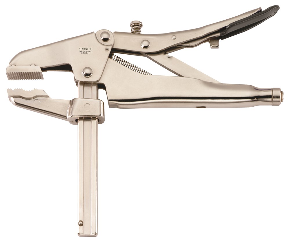 Met parallelle, gesmede bekken, met snelontspanner, voor kleine ronde delen (één bek met prisma-uitsparing) en voor grote werkstukken geschikt, ook voor het zonder beschadigen spannen van kwetsbare werkstukken, Chroom-Vanadium.