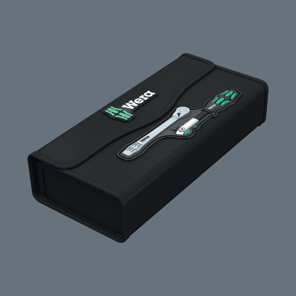 De compacte ratelset met een 1/4" Zyklop Speed-ratel en een 1/4" Zyklop Metal-ratel met omschakelpal alsmede 6 accessoires. Ratel Zyklop Speed met rotatiemassaconstructie en sneldraaibus met goede grip voor snel werken; vrij zwenkbare ratelkop; met vaste standen bij 0° en 90° naar links en rechts alsmede 15° vanuit 90° naar binnen; in 0° stand te gebruiken als conventionele schroevendraaier; met veiligheidsvergrendeling van doppen ook in schroevendraaierstand; voorzien van omkeer van werkrichting; fijne vertanding; kleine terughaalhoek van 5°;met meerdelige Kraftform-handgreep voor vermoeiingsarm werken; Ratel Zyklop Metal met omschakelpal; slanke constructie maakt ook werken op plaatsen met beperkte ruimte mogelijk; geringe kleine terughaalhoek van 5° dankzij fijne vertanding met 72 tanden; met omschakelpal voor makkelijk wisselen van ratelrichting; met veilige dopvergrendelfunctie; gesmede massief metalen ratel (chroom-molybdeen) voor extra hoge robuustheid en lange levensduur; ongelooflijk compacte indeling voor veel gereedschap op weinig ruimte; uiterst compact stoffen etui met hoge robuustheid en lange levensduur; rechtop te plaatsen voor overzichtelijke opslag in gereedschapsrek; vanwege de stoffen buitenzijde ook probleemloos op kwetsbare oppervlakken te leggen; laag gewicht en gering volume en daardoor makkelijk mee te nemen.