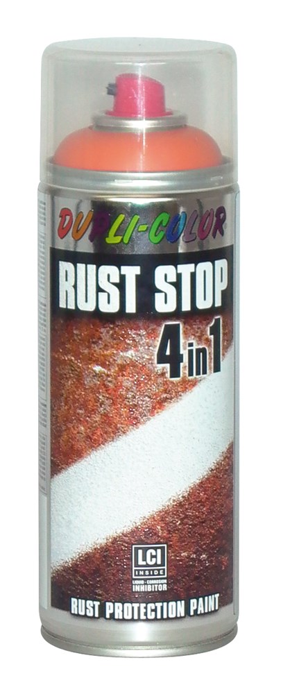 Het RUST STOP 4 in 1 systeem (Liquid Corrosion Inhibitor technologie) is een universeel toepasbaar oplosmiddelhoudend laksysteem, waarbij een effectief roestwerende werking gecombineerd wordt met een uitstekende dekkracht: 1. Grondverf / 2. Actieve roestbescherming / 3. Hoogdekkende acryllak / 4. Beschermende toplaag. RUST STOP kan direct op roest worden toegepast, is sneldrogend, elastisch, 100% UV- en weersbestendig en heeft uitgehard een zeer hoge slagvastheid. Door de hoge dekkracht en de zeer goede vloei is RUST STOP zeer gebruiksvriendelijk. RUST STOP is voorzien van een variabele sproeikop, waardoor verf op grote oppervlakken in een gelijkmatige laag aangebracht kan worden, ook op minder toegankelijke plaatsen. Afhankelijk van de stand van de sproeikop kan de lak in zowel horizontale als verticale lagen aangebracht worden. RUST STOP biedt een langdurige bescherming tegen roest en is beschikbaar in verschillende satijnen effectkleuren.