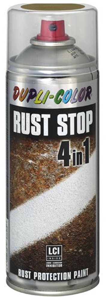 Het RUST STOP 4 in 1 systeem (Liquid Corrosion Inhibitor technologie) is een universeel toepasbaar oplosmiddelhoudend laksysteem, waarbij een effectief roestwerende werking gecombineerd wordt met een uitstekende dekkracht: 1. Grondverf / 2. Actieve roestbescherming / 3. Hoogdekkende acryllak / 4. Beschermende toplaag. RUST STOP kan direct op roest worden toegepast, is sneldrogend, elastisch, 100% UV- en weersbestendig en heeft uitgehard een zeer hoge slagvastheid. Door de hoge dekkracht en de zeer goede vloei is RUST STOP zeer gebruiksvriendelijk. RUST STOP is voorzien van een variabele sproeikop, waardoor verf op grote oppervlakken in een gelijkmatige laag aangebracht kan worden, ook op minder toegankelijke plaatsen. Afhankelijk van de stand van de sproeikop kan de lak in zowel horizontale als verticale lagen aangebracht worden. RUST STOP biedt een langdurige bescherming tegen roest en is beschikbaar in verschillende satijnen effectkleuren.