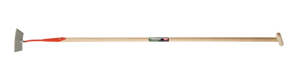 Schoffel met geverniste essen steel, ideaal om al duwend onkruid te verwijderen, te harken en te wieden