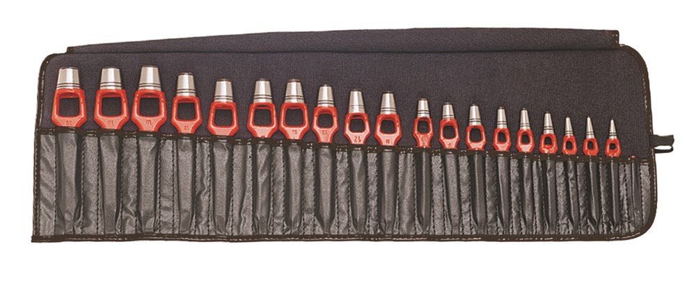 19-delig, gelegeerd staal, snijkant gehard, in kunstlederen roltas.