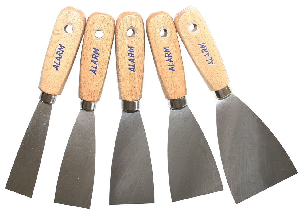5-delig, DIN 7216, met houten handvat en flexibele, geslepen kling, inhoud: 30, 40, 50, 60 en 80 mm.