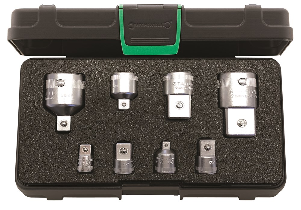 In kunststoffen doos, 8-delig, inhoud: 1/4’’ binnen op 3/8’’ buiten, 1/4’’ binnen op 1/2’’ buiten, 3/8’’ binnen op 1/4’’ buiten, 3/8’’ binnen op 1/2’’ buiten, 1/2’’ binnen op 3/8’’ buiten, 1/2’’ binnen op 3/4’’ buiten, 3/4’’ binnen op 1/2’’ buiten, 3/4’’ binnen op 1’’ buiten.