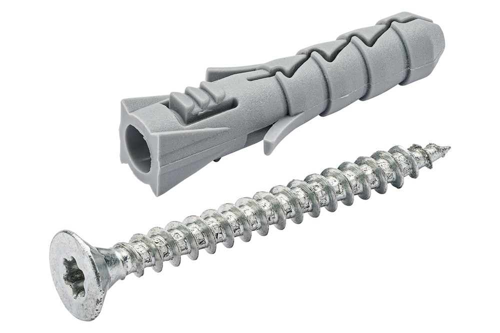 Set van spaanplaatschroeven platkop verzinkt TX 5.0x50 met nylon pluggen 8 mm.
