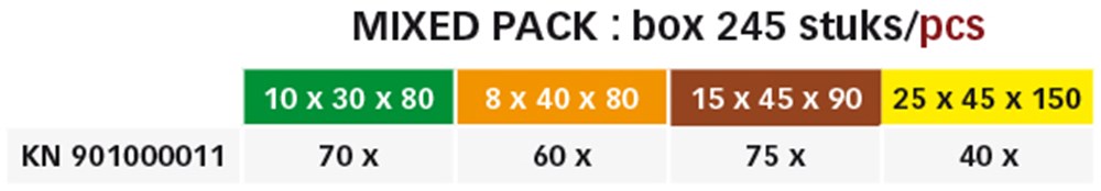 inhoud: 70 x 10 x 30 x 80 mm, 60 x 8 x 40 x 80, 75 x 15 x 45 x 90, 40 x 25 x 45 x 150