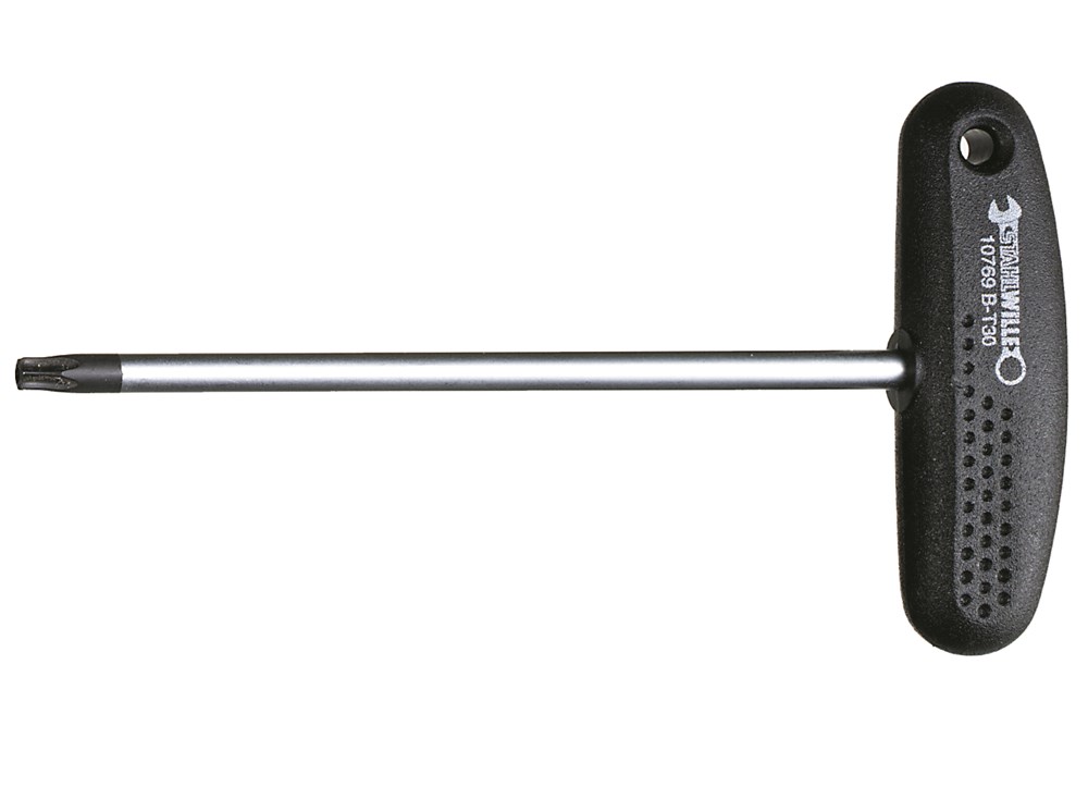 Met boorgat in de punt (TORX® TAMPER RESISTANT), kling nikkelverchroomd, punt gehard, Chroom-Vanadium, matverchroomd, zwarte punt.