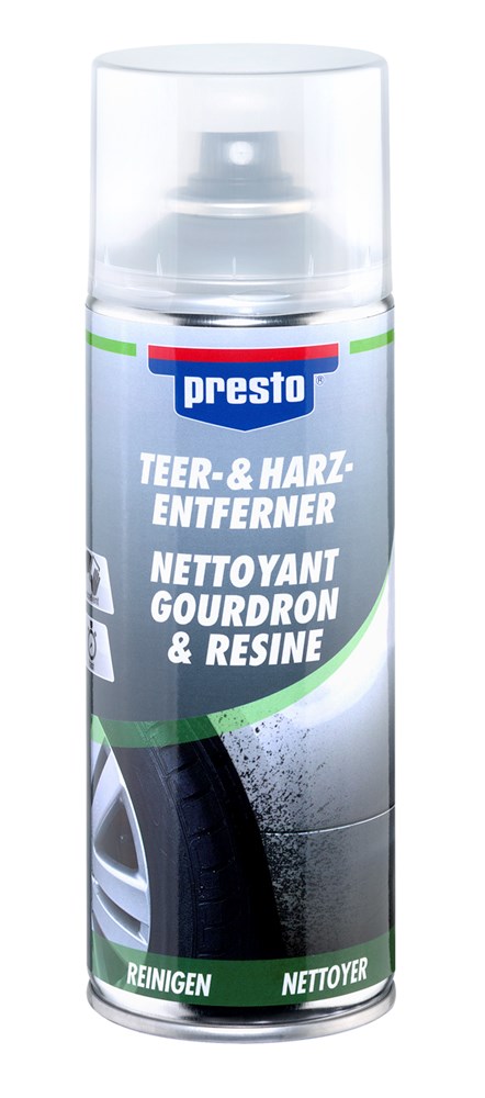 presto Teerverwijderaar verwijdert teer betrowubaar maar zacht, alsook bitumen, olie, vet en was lak en chroom.