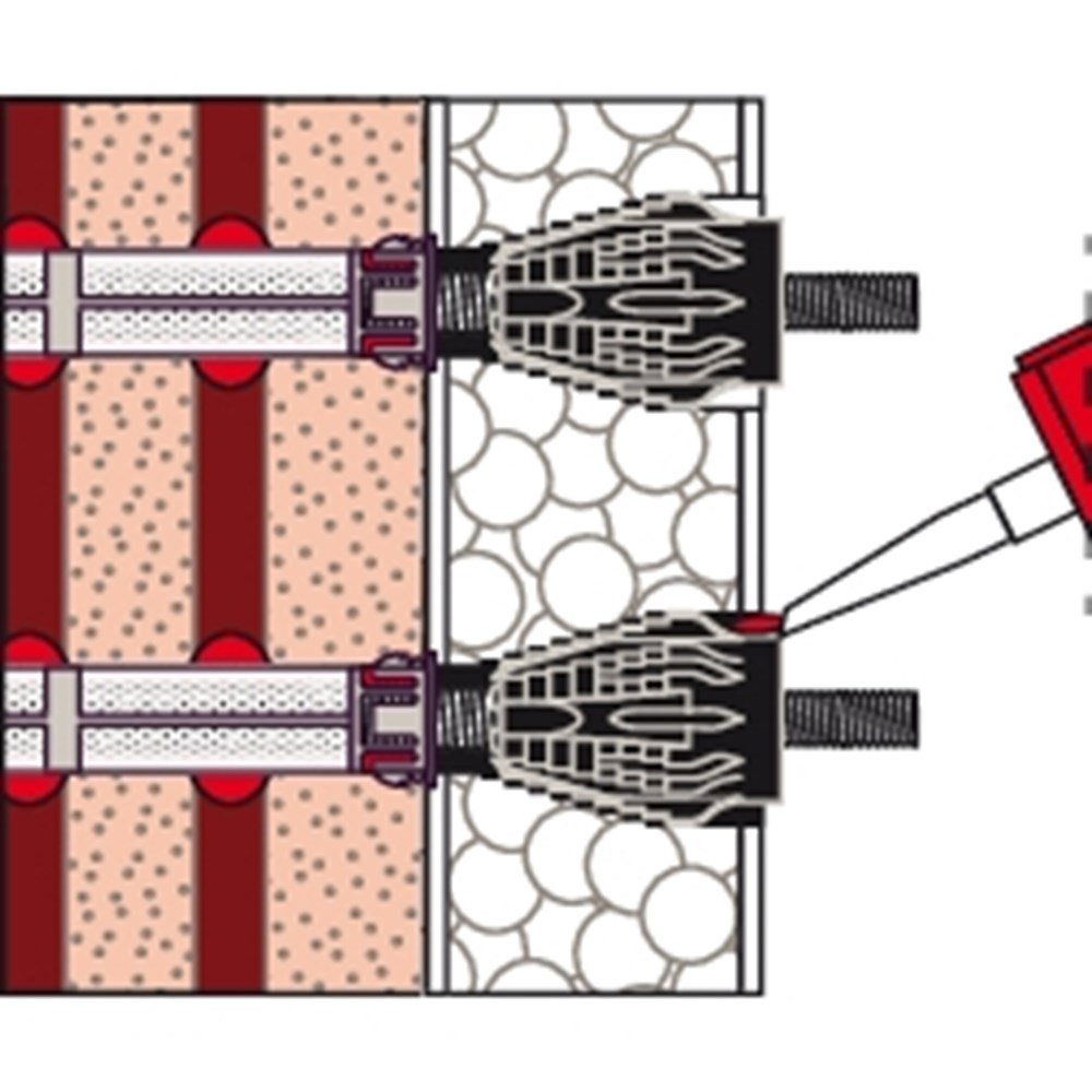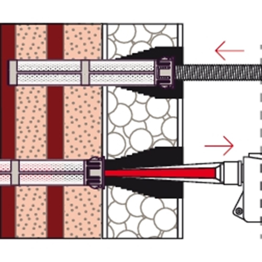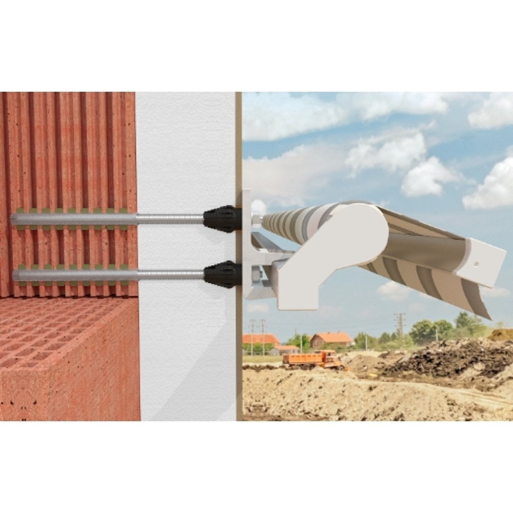Het fischer Afstandsmontagesysteem TherMax is een oplossing voor een bevestiging in de buitenmuur of warmtebrug in de WDVS. Het systeem bestaat uit een speciale draadstang van gegalvaniseerd staal met een glasvezelversterkte conus, tapeinden en injectiehulzen voor de bevestiging in geperforeerde baksteen. In combinatie met de fischer Krachtige mortel FIS EM Plus, FIS V, FIS SB en de FIS GREEN is het systeem goedgekeurd voor talrijke bouwmaterialen. De draadstang met de glasvezelversterkte conus freest zich automatisch door de pleister in het isolatiemateriaal. De draadstang wordt in de injectiehuls met een injectiemortel in het bouwmateriaal verankerd. De conus op de kop van de draadstang onderbreekt de warmtebrug en neemt het tapeind van roestvast staal voor de buitenste bevestiging op. De TherMax bevestigt zware lasten zoals zonweringen, bewakingsmaatregel en satellietinstallaties in beton, cellenbeton en metselwerk van volle en geperforeerde baksteen.