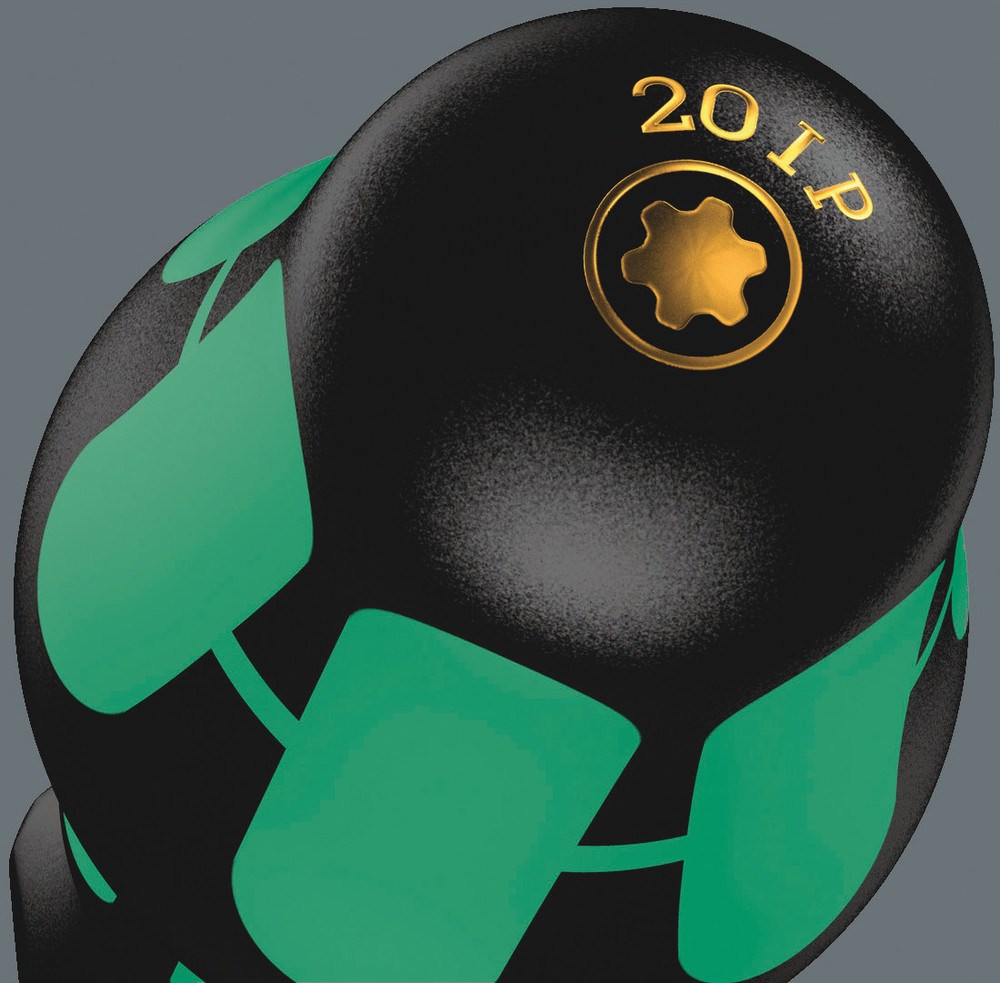 Hoogwaardige Kraftform Plus schroevendraaiers van Wera. TORX PLUS® profiel: In vergelijking tot het ‘normale’ TORX® profiel wordt een vergroting van de 6 zijden die zorgen voor overdracht van het draaimoment tussen gereedschap en schroef verkregen middels een ellipsvormige profielopbouw in tegenstelling tot de normale ronde opbouw. Daardoor wordt de uitgeoefende kracht bij het schroeven over grotere vlakken verdeeld. Er worden nu hogere draaimomenten overgedragen, terwijl de levensduur van schroef en gereedschap extra worden verhoogd. Meerdelige Kraftform-handgreep voor snel en veilig werken. Kraftform Plus: Harde gripzones voor een hoge werksnelheid, zachte gripzones voor een hoge draaimomentoverdracht. De Wera Black Point-punt biedt een hoge pasnauwkeurigheid en extra bescherming tegen corrosie. Zeskantige wegrolbescherming verhindert telkens wegrollen op de werkplek. Met handgreepcodering om het gereedschap gemakkelijker te vinden en te sorteren.