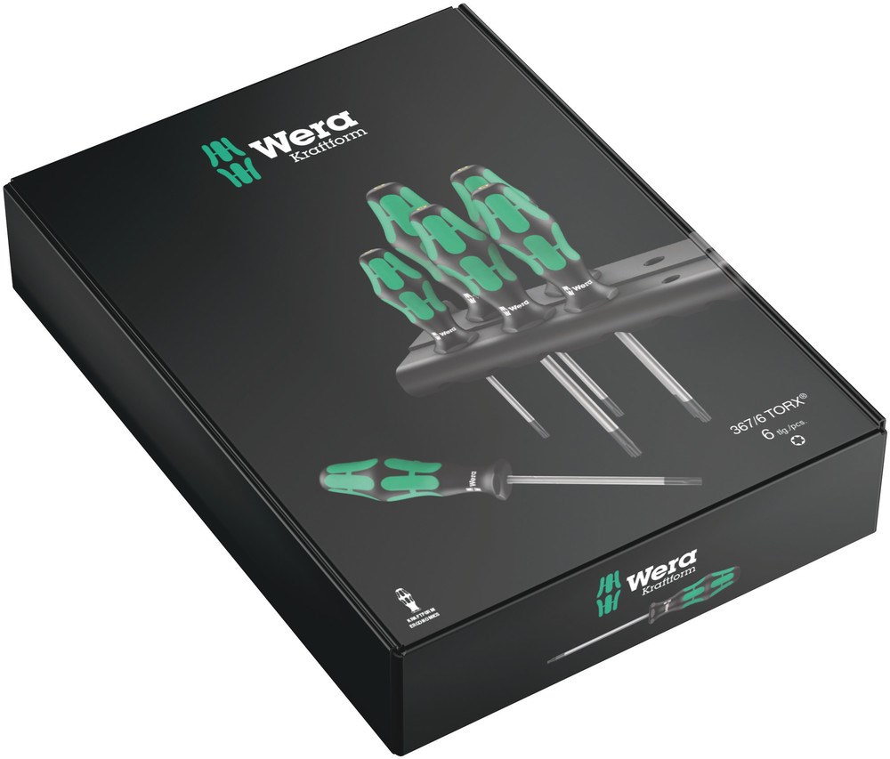 6-delige schroevendraaierset voor TORX® schroeven. Meerdelige Kraftform-handgreep voor snel en veilig werken. Kraftform Plus: Harde gripzones voor een hoge werksnelheid, zachte gripzones voor een hoge draaimomentoverdracht. De Wera Black Point-punt en een uitgebreide harding garanderen een lange gebruiksduur van de punt en zorgen voor extra corrosiebescherming en een hoge pasnauwkeurigheid. Met "Take it easy" toolfinder": Kleurcodering op profiel en maatcode. Zeskantige wegrolbescherming verhindert telkens wegrollen op de werkplek. Wordt geleverd met handig rack waarin de schroevendraaiers overzichtelijk kunnen worden opgeborgen.