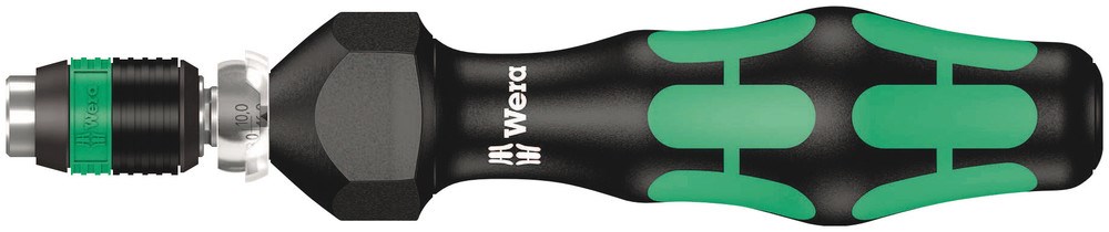 Wera draaimomentschroevendraaier. Variabele draaimomentinstelling, uiterst nauwkeurig. Vereist draaimoment eenvoudig instelbaar, zonder extra gereedschap. Schaalwaarde goed leesbaar. Rapidaptor-snelwisseltechnologie maakt razendsnel wisselen van bit mogelijk. Onbegrensd losdraaimoment voor het losdraaien van vastzittende schroeven. Meervoudige Kraftform-handgreep met geïntegreerde harde en zachte delen voor een hoge werksnelheid en bescherming van de handen. Geschikt voor plaatsing van bits met 1/4" buitenzeskant-aandrijving conform DIN ISO 1173-C 6,3 en E 6,3 (ISO 1173).