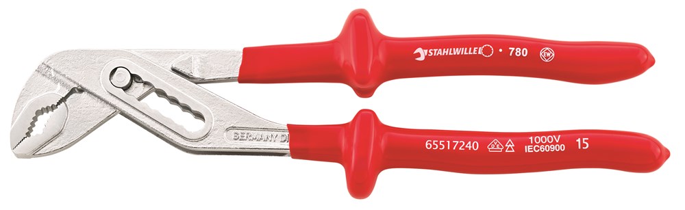 DIN ISO 8976 (nr. 207 c), met doorgestoken scharnier en uitsparing, 7-voudig verstelbaar, met klembeveiliging, Chroom-Vanadium. VDE-geïsoleerd, DIN EN 60900, AC 1000 V.