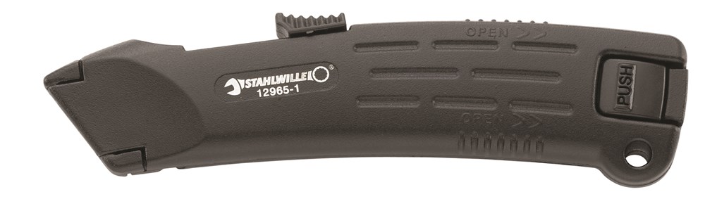 Met automatische terugtrekking van het mesje. In de greep is plaats voor reserve mesjes. Verwisselen van mesje zonder gereedschap. Met ophangoog. Geschikt voor het snijden van karton, rubber, leer, hout enz. Behuizing uit zamac.