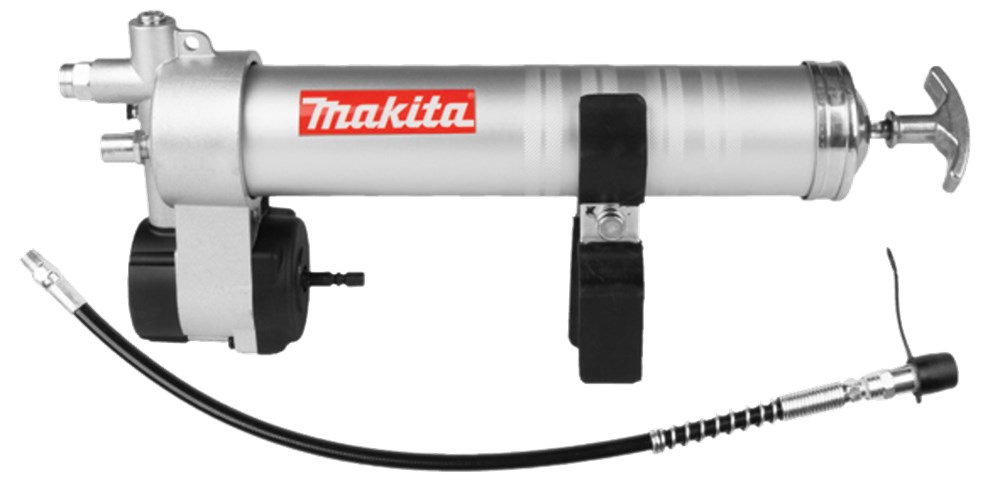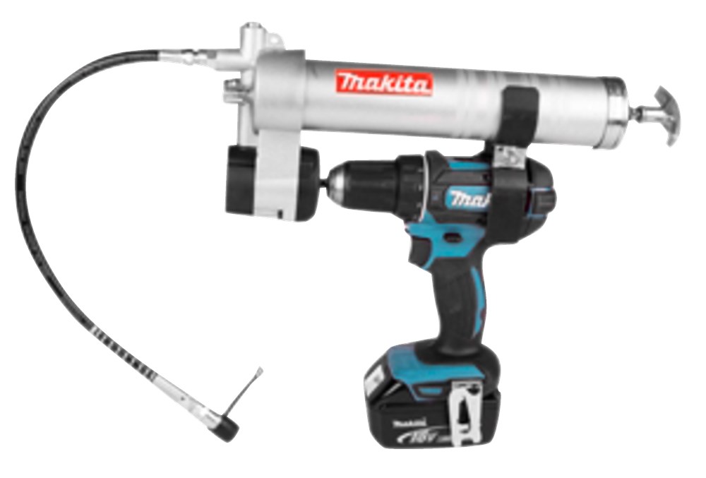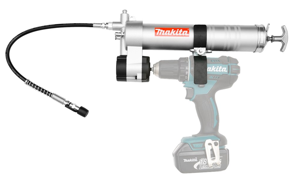 Robuuste universele vetspuit die eenvoudig te bevestigen is op de meeste 10,8 V – 18 V boor-/schroefmachines, bijvoorbeeld de DDF484. Hij is geschikt voor vetpatronen van 400 cc. De flexibele slang van 450 mm zorgt ervoor dat zelfs de moeilijkste plekken bereikbaar zijn. Opbrengst circa 100 cc per minuut. Maximale werkdruk 550 bar. Aanbevolen werkdruk 275 bar.