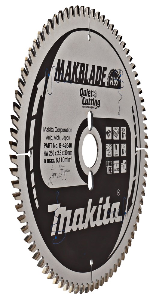 Makblade Plus tafelzaagbladen specifiek ontworpen voor het zagen van gemelamineerde (spaan)platen en MDF. De TCG vertanding, teflon coating en antivibratie sleuven zorgen voor een schitterende zaagsnede waarbij lijmhoudende materialen niet aan het zaagblad blijven kleven. Passend op Makita Model: 2704, 2704N, 2704NX1, 2704X, LF1000, LH1040F