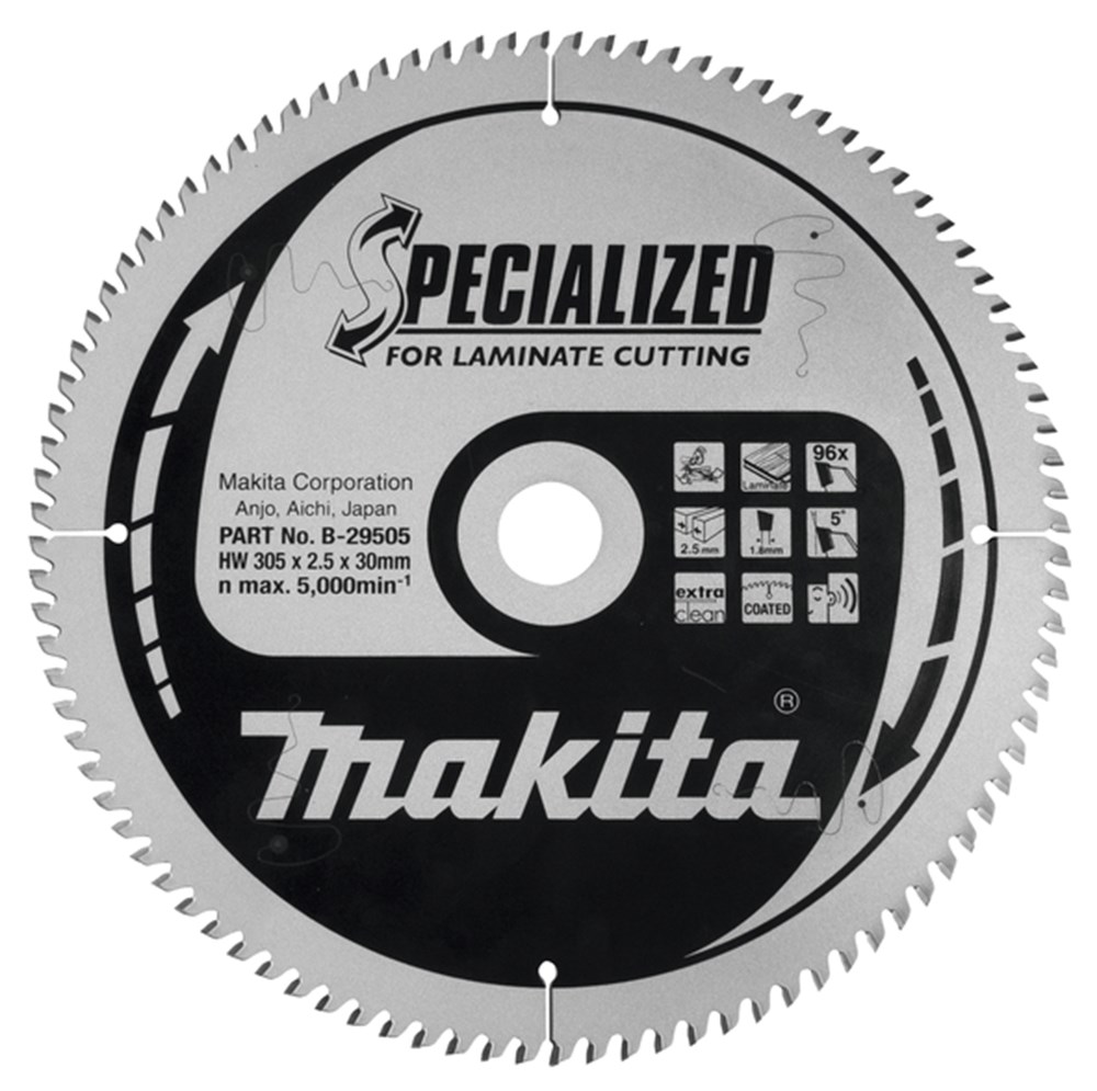 Makita hardmetalen zaagbladen, speciaal ontwikkeld voor het verzagen van laminaat. SPECIALIZED zaagblad (B-33847) voor extra zuiver zagen in laminaat (Extra Fine Cut). Speciaal ontwikkeld voor verstekzagen.