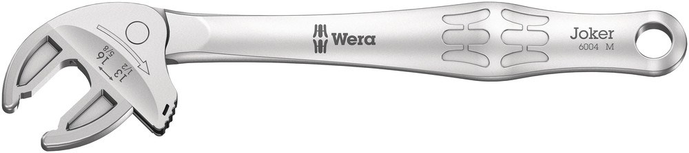 Veel gebruikers zouden graag willen beschikken over een universeel gereedschap dat voor zoveel mogelijk zaken te gebruiken is. Eén stuk gereedschap voor meerdere metrische en duimse maten. En dit zou zich dan ook nog eens automatisch aan de verschillende schroefmaten moeten aanpassen. Veilig vastgrijpen, niets beschadigen en een hoge werksnelheid mogelijk maken. Middels de traploos en parallel lopende bekken worden meerdere steeksleutelformaten vervangen. De vereiste maat wordt automatisch bij het aanzetten op de zeskant-moer en schroef ingesteld. Het geïntegreerde hefboommechanisme klemt de zeskant-schroef resp. moer tussen de bekken veilig in, hetgeen het risico op wegglijden en beschadigingen aanzienlijk verkleint. De ratelfunctie maak snel en soepel schroeven zonder telkens het gereedschap te moeten verplaatsen mogelijk. Door toepassing van hoekprisma’s wordt een terughaalhoek van slechts 30° gerealiseerd. De 1-zijde-constructie in combinatie met de ratelfunctie en het hoekprisma maakt werken in krappe ruimtes mogelijk. De instelbare Joker 6004 is hét universele schroefgereedschap. Zelfinstellend. Vastgrijpend. Ratelend.