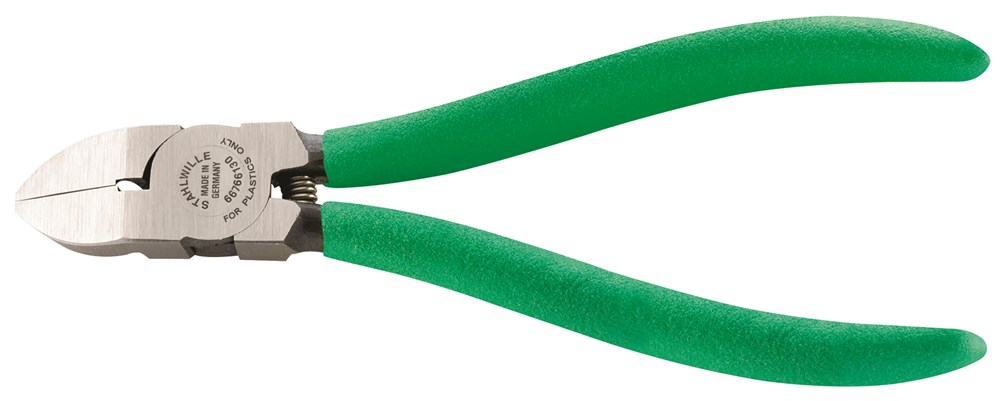 Voor kunststoffen spuitgietdelen, met rechte snijvlakken, 30° gebogen, zonder snijfase voor het glad afknippen van randen van spuitgietdelen en bramen, met openingsveer, snijvlakken inductief gehard.